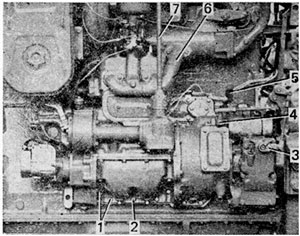 Снятие. Слейте охлаждающую жидкость из системы охлаждения дизеля и масло из поддона пускового двигателя. Закройте краник бензобачка. Снимите воздухозаборник и заднюю крышу капота. Отсоедините от карбюратора топливную трубку, тросики управления заслонками, тягу регулятора. Отсоедините тяги от рычагов управления муфтой 4 сцепления, редуктора 3 и стартера 5. Снимите рычаги муфты сцепления и редуктора. Выверните четыре болта и снимите кронштейн с валиком 7 заводной рукоятки. Отсоедините впускной и выпускной коллекторы пускового двигателя 6 от выпускного коллектора дизеля.
