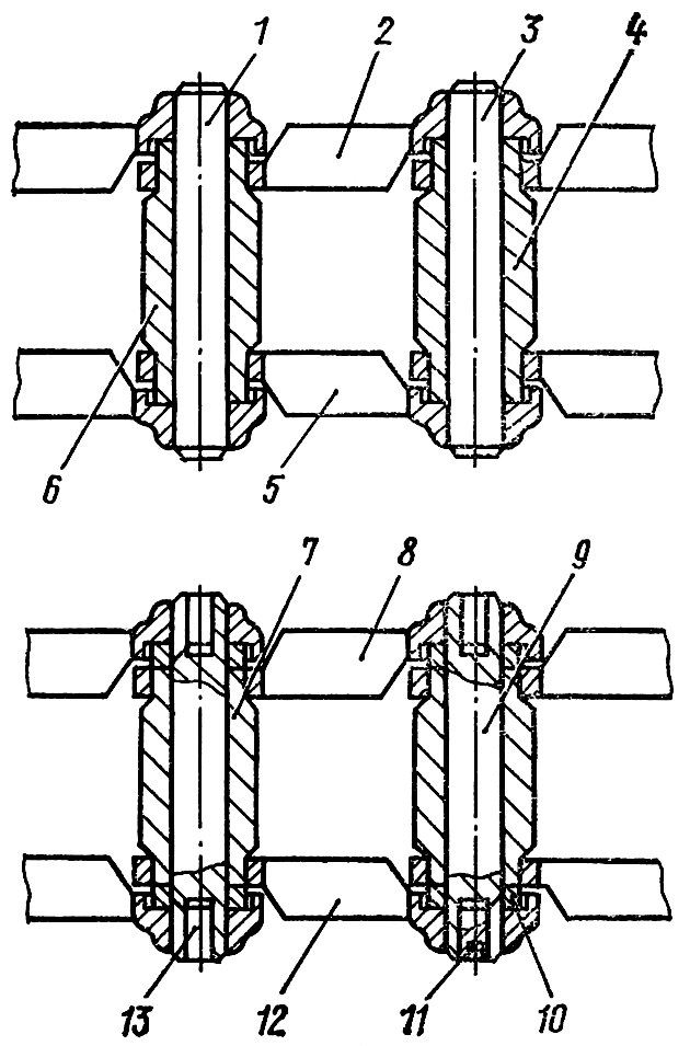 • установите замыкающие пальцы 9, конусные стопоры 13 и пробки 11, снятые башмаки.