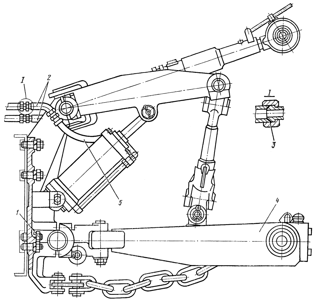Прикрепите приспособлением ( рис. 333 ) механизм навески к подъемнику. Масса механизма навески 1135 кг. Отверните десять гаек 1 ( см. рис. 332 ) со шпилек крепления механизма 4 навески и снимите механизм навески с трактора. Отверните накидные гайки рукавов 5 высокого давления, снимите рукава. Снимите при необходимости трубы 2, отвернув накидные гайки. Закройте заглушками (из ЗИП) концы труб и штуцеров гидроцилиндров во избежание попадания грязи.