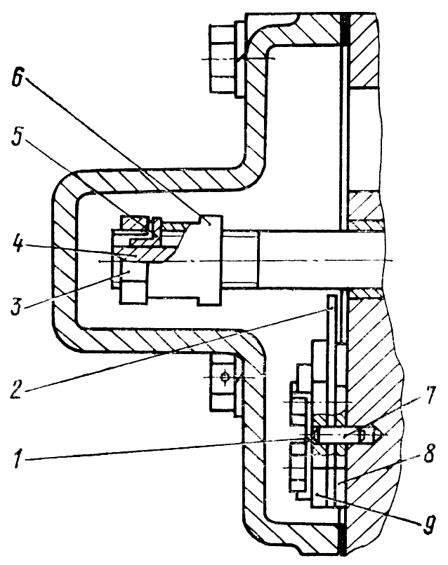 Установите на корпус заднего подшипника прокладку толщиной (0,6+0,1) мм, смазав ее солидолом, и установите на шпильки крышку 30 подшипника. Закрепите крышку подшипника и подшипник четырьмя гайками с пружинными шайбами.