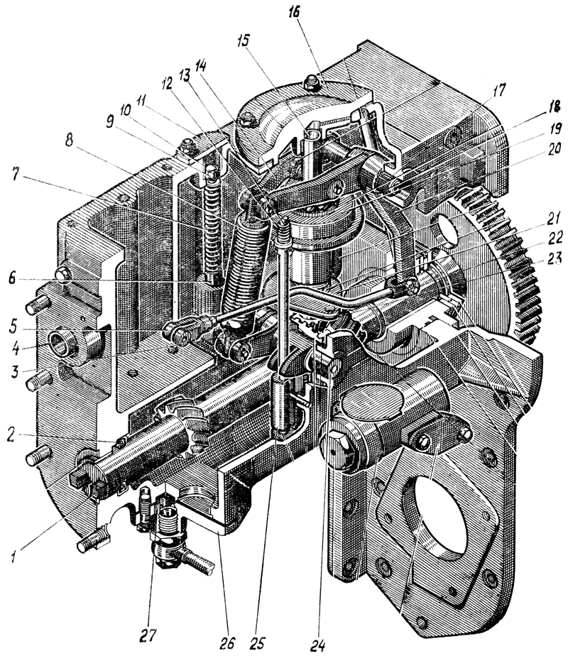 Выньте кулачковый валик 26 вместе с подшипником 28 и прокладкой, поворачивая его так, чтобы затылки кулачков становились против толкателей, утопив их в Гнездах корпуса насоса.