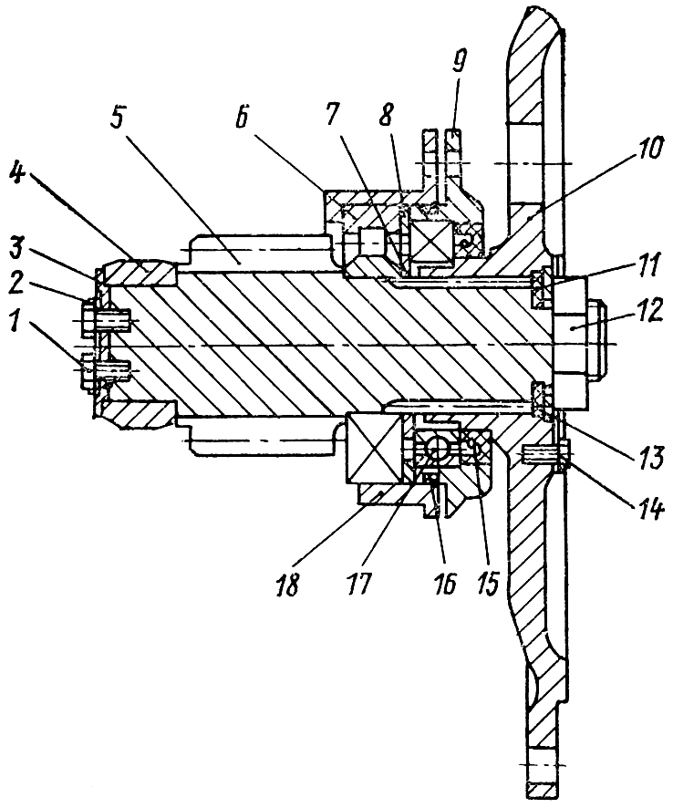 Установите ступицу фланцем вверх. Установите на неё венец 12 ( см. рис. 252 ). Наденьте на венец шестерню 4. Наденьте на болты 5 планки 6 и запрессуйте болты в отверстия венца и ступицы. Установите в канавку ступицы кольцо И и запрессуйте шарикоподшипник 9 до упора в кольцо. Запрессуйте в ступицу наружное кольцо 8 роликоподшипника до упора в шарикоподшипник. Установите крышку 10 и закрепите ее восемью, болтами со стопорными пластинами 7. Момент затяжки болтов 40...60 Н•м (4...6 кгс • м). Отогните концы стопорных пластин на грани головок болтов. Переверните ступицу фланцем вниз. Наденьте на болты 5, запрессованные в отверстия венца и ступицы, стопорные пластины 3 отогнутыми концами вверх и наверните на болты гайки 2. Момент затяжки гаек 200...300 Н • м (20...30 кгс-м). Отогните концы пластин на грани гаек. Установите стопорное кольцо 14 в канавку ступицы. Запрессуйте наружное кольцо 1 роликоподшипника до упора в стопорное кольцо.