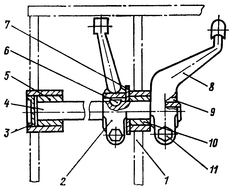 Запрессуйте в отверстия корпуса 1 ( см, рис. 221 ); бортовых фрикционов втулки 5 и 10. Соберите рычаги 2 и 8 с болтами, гайками и шайбами. Вставьте с наружной стороны корпуса бортовых фрикционов в отверстия валик 4, наденьте на него рычаг 2 и шайбу 7. Проверьте легкость вращения валиков. Установите на валик внутреннюю шпонку б и посадите на шпонку внутренний рычаг 2 и закрепите болтом с гайкой и шайбой. Установите с наружной стороны валика 4 шпонку 9 и наденьте на валик наружный рычаг 8 и закрепите болтом. Осевой люфт валика 4 после закрепления на нем рычагов должен быть не более 1 мм. Запрессуйте заглушку 3. Отрегулируйте длину тяги 8 ( см. рис. 219 ) вилкой 10 так, чтобы зазор между головкой наружных рычагов 17 тормоза и корпусом бортовых фрикционов при крайнем заднем положении двуплечего рычага 12 был 0...2 мм. Регулируйте до присоединения тяг 6. При указанном положении наружных рычагов 17 соедините тягами 6 наружные рычаги 17 с рычагами 16 механизма управления поворотом, когда последние находятся в крайнем заднем положении. Соедините двуплечий рычаг 12 с внутренним рычагом отрегулированной тягой 8. Присоедините к наружному рычагу 17 тягу 6 с пружиной 5. Отрегулируйте положение педали 15 тормоза. При полном выключении тормоза педаль должна быть расположена под углом (60±5)° к горизонтали. Регулирование тормозов должно обеспечивать полную затяжку ленты тормоза (ведущее колесо должно резко останавливаться) при ходе на себя рычага 14 управления поворотом со стороны выключенного бортового фрикциона. Пружина 5 должна полностью и безотказно возвращать систему приводов и тормозные ленты в положение полного отключения тормоза.