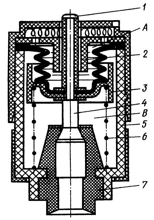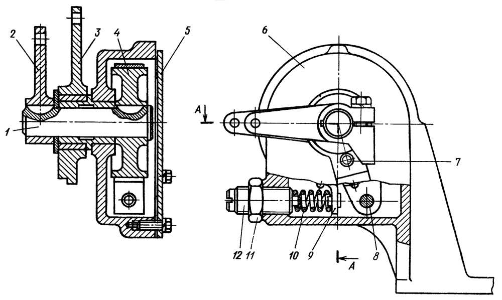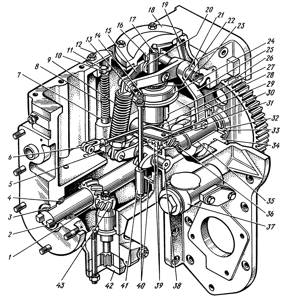 Регулирующая муфта при этом должна соприкасаться с пружиной корректора без деформации пружины (подложить под пружину щуп толщиной 2,8 мм для двигателя Д-160 и 3,6 мм — для двигателя Д-160Б); грузики регулятора прижаты к вертикальному валику, а подвижная муфта регулятора — к роликам рычагов (торец муфты не должен доходить до сухариков грузиков на 1,5—3 мм).