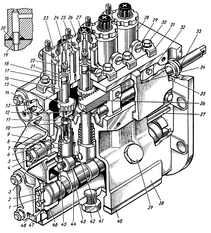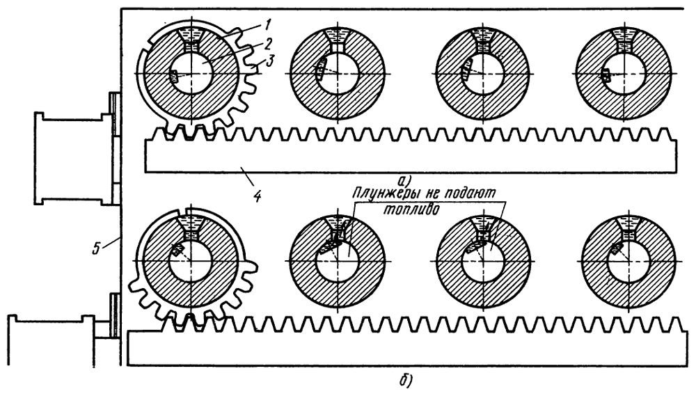 За счет допуска на равномерность можно отрегулировать четкое автоматическое выключение и включение подачи топлива II и III секциями, поворачивая зубчатый сектор на плунжере.