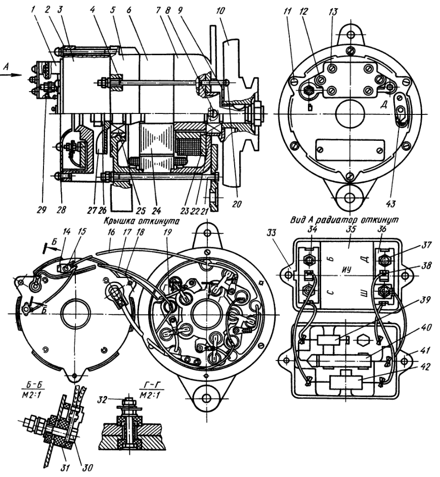 Генератор, представляющий собой бесконтактную пятифазную одноименнополюсную машину с односторонним электромагнитным возбуждением с встроенными выпрямителем и регулятором напряжения, состоит из выпрямительного блока 3 (БПВ 12-100), статора 6, ротора 24, передней 7 и задней 5 крышек, катушки возбуждения 23, шкива 10 и крыльчатки 27 для охлаждения выпрямителя.