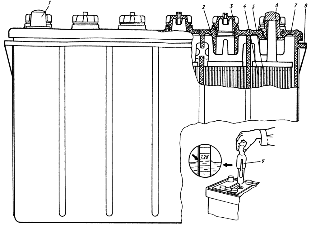 Плотность электролита замеряют ареометром 9, для умеренной климатической зоны она должна быть 1,26±0,01 г/см³ у полностью заряженной батареи.