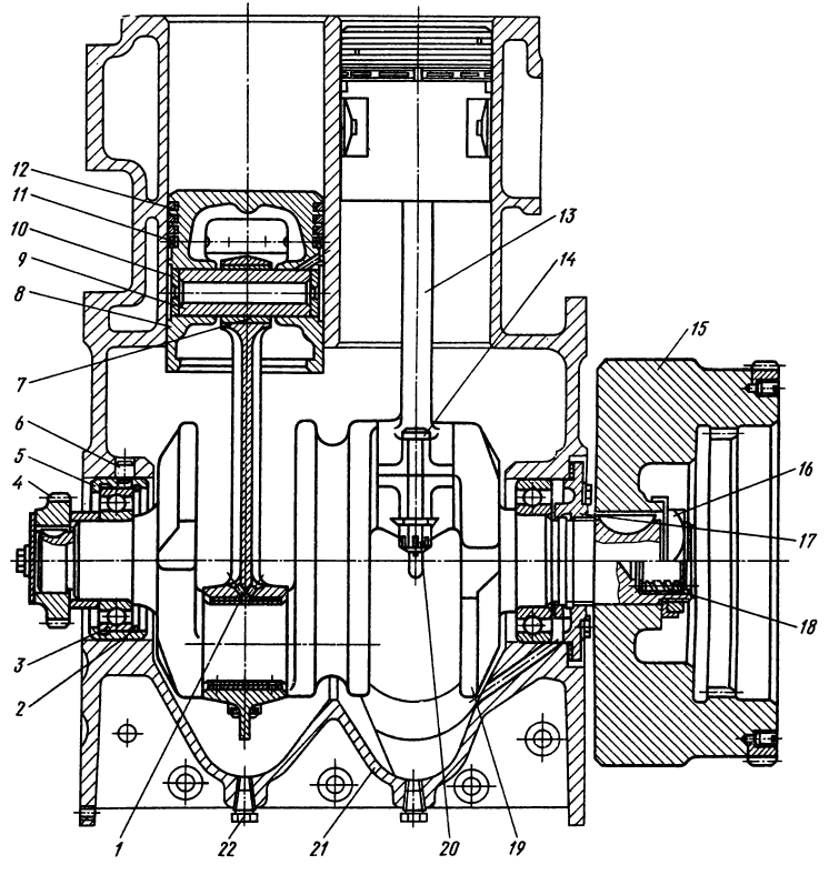 На валу редуктора смонтирован механизм включения, имеющий шестерню 15 со спиральными зубьями, вводимую рычагом при пуске ее в зацепление с венцом маховика дизеля. Через эту шестерню пусковой двигатель прокручивает коленчатый вал дизеля. Шестерню в зацеплении с венцом маховика удерживают две защелки 17, сжимаемые пружиной 19. Как только дизель заведется, защелки под действием центробежной силы расходятся, и шестерня механизма включения автоматически,выходит из зацепления с венцом маховика дизеля благодаря давлению зубьев венца маховика на спиральные зубья шестерни и пружины 16 через толкатель 21.