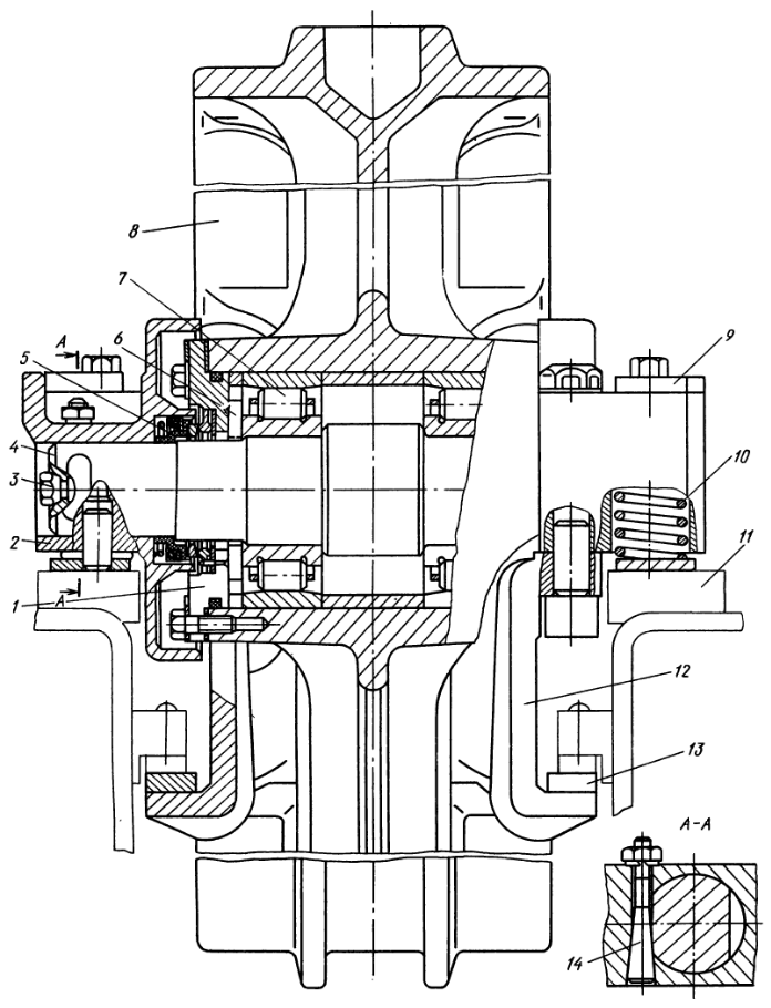 Хвостовики оси входят в отверстия внутренней и наружной опор 2. Фиксация оси в опорах осуществляется стопором 14.